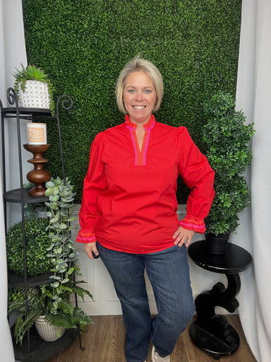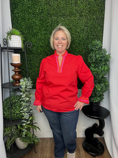 striped trim ruffle split neck blouse - fiery red
