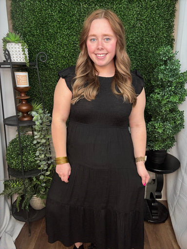 Effortlessly elegant, this black midi dress features a softly textured smocked bodice that offers a comfortable, flattering fit. The flutte...