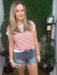 Playful yet polished, this knit top features soft textured stripes in a fresh contrast color for a fun, eye-catching look. The relaxed cap sleeves and ribbed trims add subtle structure while keeping the silhouette easy and comfortable.
