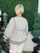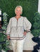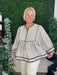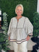 Stripe pattern ¾ sleeve top featuring multicolor band and hem detail. Unlined. Woven. Non-sheer. Lightweight.