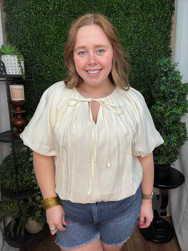 Soft and airy, this ivory peasant blouse features a relaxed silhouette with delicate gathering throughout the neckline for a light, flowy drape. Th...
