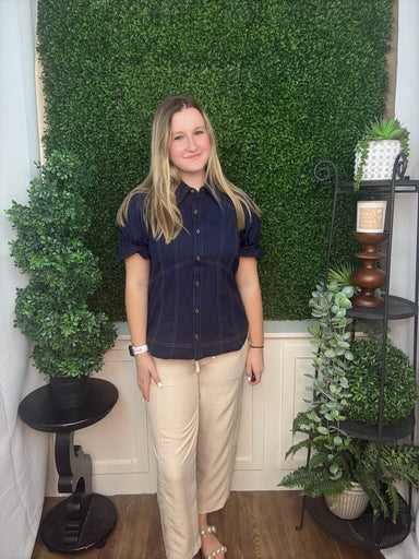 Tailored paneling meets feminine volume in this structured yet playful blouse. Defined seam lines with contrast stitching create a flattering, cors...