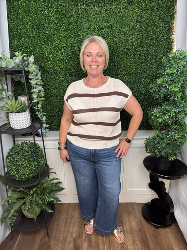 Clean and versatile, this sleeveless knit tank features soft mocha and cream horizontal stripes for a warm, neutral look. The textured knit adds su...