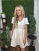 Delicate and feminine, this ivory mini dress features an allover textured fabric that adds soft dimension and romantic detail. The flattering V-neckline is accented with a subtle front cutout, while voluminous puff sleeves create a charming, statement silhouette.