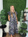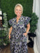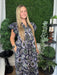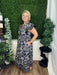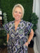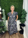 This navy midi dress showcases a charming multi-print design paired with delicate flutter sleeves, offering a cute and stylish look. Its flowing silhouette provides comfort and grace, making it an ideal choice for both casual days and special occasions.