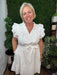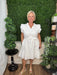 Fresh and effortlessly feminine, this textured off white dress features delicate flutter sleeves trimmed with soft scalloped edges for a romantic touch. The notched neckline is framed with subtle lace detailing, while the adjustable tie waist creates a flattering, customizable fit. Gentle gathers and a tiered ruffle hem add movement and a breezy feel, making it perfect for warm days and easy styling.