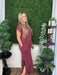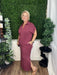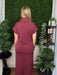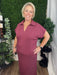 Solid knit split collar short sleeve midi pullover midi dress featuring side slit. Pockets at sides. Unlined. Knit. Non-sheer. Lightweight.