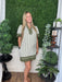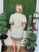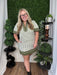 Stripe pattern short lantern sleeves pullover mini dress with slit hem featuring contrast accent caftan-inspired split collar band and hem. Side Pockets. Lined. Woven. Non-sheer Midweight.