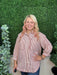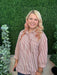 Textured stripe pattern reverse cuff ¾ sleeve shirt. Double shirt pockets at front. Unlined. Woven. Non-sheer. Lightweight.