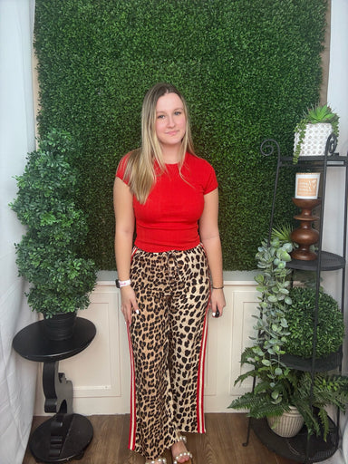 Make a bold statement with our Brown Leopard Print Stripe Side Track Pants — where sporty meets fierce. Featuring an allover brown and black leopar...