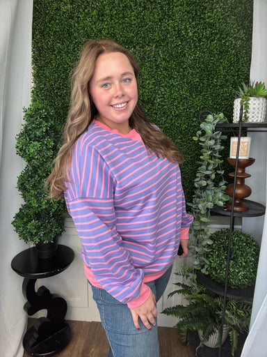 This oversized knit top in soft lavender and pink stripes offers cozy comfort with a casual, cute look. Its roomy fit makes it perfect for relaxing...