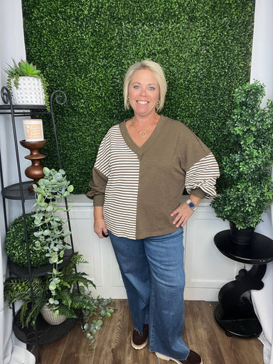 This oversized knit top features cozy denim and cream stripes, blending comfort with a casual, cute style. Its relaxed fit makes it perfect for lay...