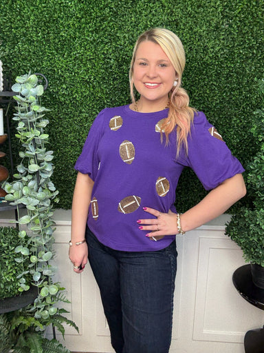 Show your team spirit in style with the Tina Footballs Top in vibrant purple and gold. Designed for comfort and flair, this top is perfect for game...