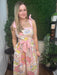 A whimsical mixed print brings cheerful character, while the coordinating gingham trim and waist tie create flattering shape and visual contrast. The midi-length silhouette flows effortlessly, making it perfect for warm-weather gatherings, vacations, or sunny weekend outings.
