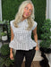 Sleek and structured, this black and white striped sleeveless shirt features delicate pintuck detailing along the front for added texture and a refined, tailored feel. The sharp pointed collar and hidden button placket keep the look clean and polished, while the relaxed, boxy silhouette with extended shoulders offers modern comfort.