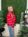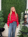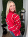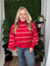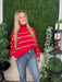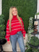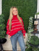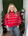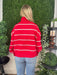The Mock Neck Oversized Stripe Sweater in Crimson combines cute style with cozy warmth. Its bold striped pattern and relaxed fit make it perfect for layering on chilly days while adding a vibrant pop of color to your look.
