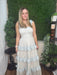 Soft and romantic, this floral midi dress features a fully smocked bodice that offers a flattering, comfortable fit. The tie-shoulder straps add a delicate, adjustable detail, while the tiered skirt with ruffle accents creates graceful movement and texture.