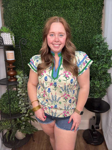 $49.99| /Fresh and lively, this blouse showcases a delicate allover botanical print that brings a soft, garden-inspired charm. The layered V-neckline is fra...