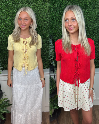Joelle, 5'6", is wearing a size small. Mackenzie, 5'5", is wearing a size small.