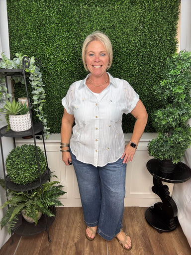 Add a soft and refreshing touch to your wardrobe with this light blue floral embroidered button-up blouse. Featuring subtle vertical pinstripes and...