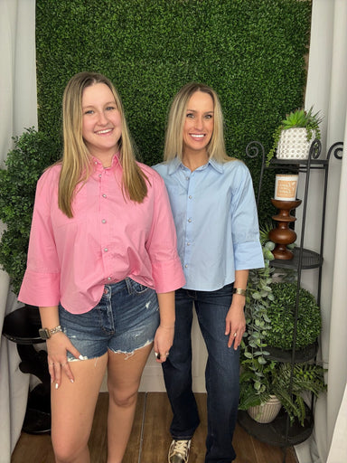Payton, 5'5", is wearing a size small. Renee, 5'2", is wearing a size large. G15617