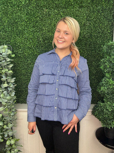This stripe tiered ruffle shirt in vibrant cobalt delivers a cute yet dressy look with its playful layers and bold color. The tiered ruffles add fe...