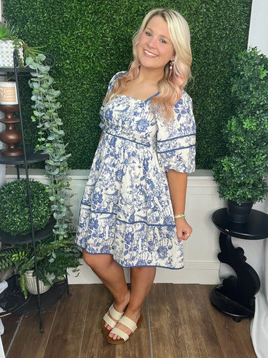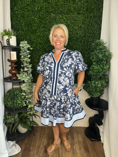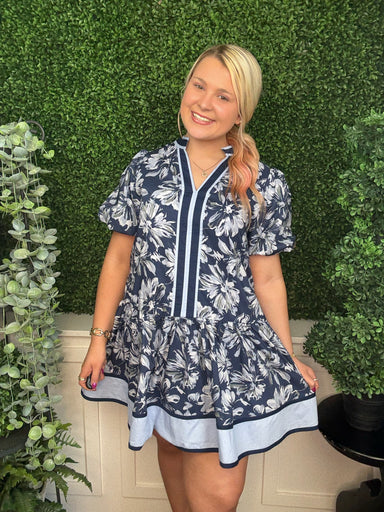 This ivory and navy floral babydoll mini dress features playful ruffle tiers for a sweet, feminine silhouette. Its lightweight fabric and charming ...