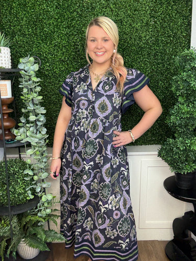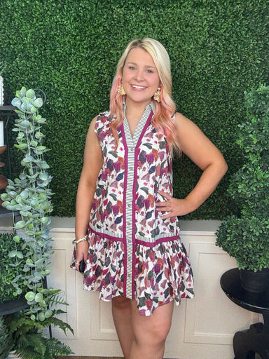 The Flower Patch Border V-Neck Open Collar Ruffle Sleeve Dress in plum mix is a charming addition to any wardrobe. Its delicate floral border, open...