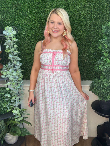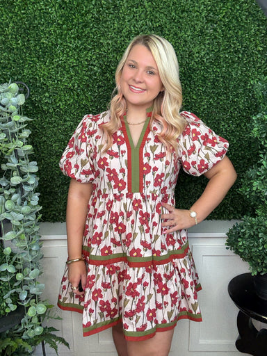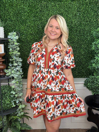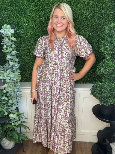 This ecru midi dress features charming floral prints and playful bubble sleeves, making it a cute and comfortable choice for football gamedays...