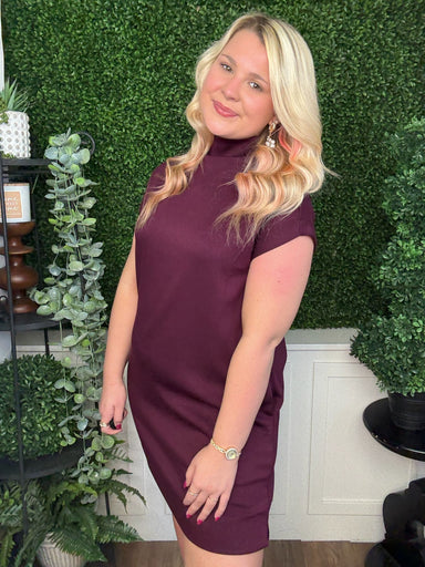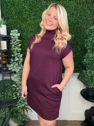 Solid jersey mock neck pullover mini dress. Side pockets. Unlined. Knit. Non-sheer. Lightweight. 55%RAYON 40%POLYESTER 5%SPANDEX Abby, 5'3" i...