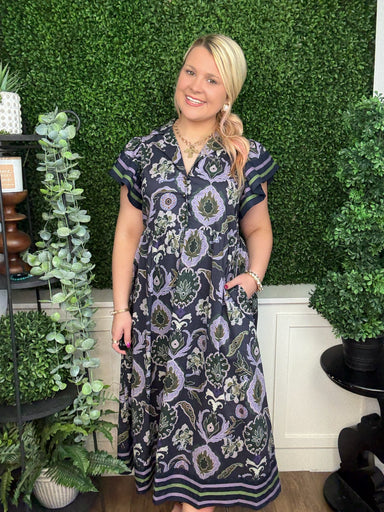 The Allie Dress features a charming quilt pattern that adds a cozy, handmade feel to your wardrobe. Its flattering fit and soft fabric make it comf...