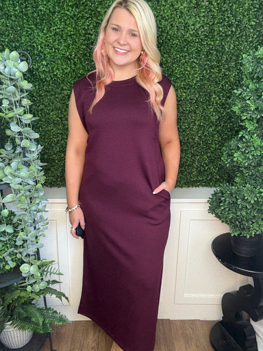 Solid jersey knit pullover midi dress featuring side slit hem. Pockets at sides. Unlined. Knit. Non-sheer. Lightweight. 55%RAYON 40%COTTON ...