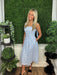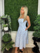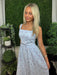 Sweet and timeless, this blue gingham midi dress is detailed with a subtle cherry print that adds a playful touch. The structured bodice gently shapes the waist before falling into a softly gathered skirt that moves beautifully with every step.