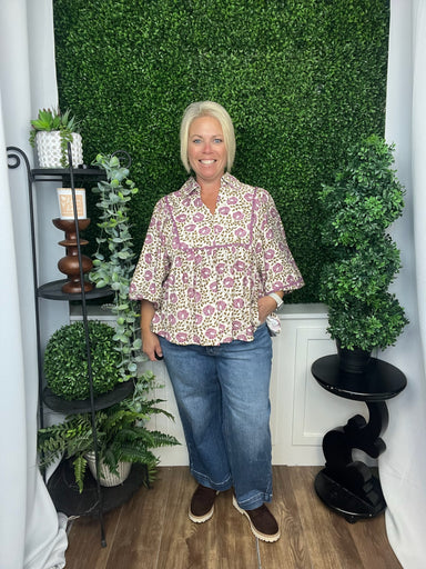 Floral print long lantern sleeve pullover split collar top featuring contrast scallop trim inset details. Unlined. Woven. Non-sheer. Lightweight...