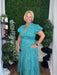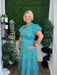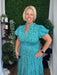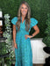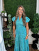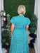 Floral print ruffle accented split V-neck pullover tiered midi dress with bubble short sleeves featuring elastic waistband. Lined. Woven. Non-sheer. Lightweight.