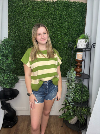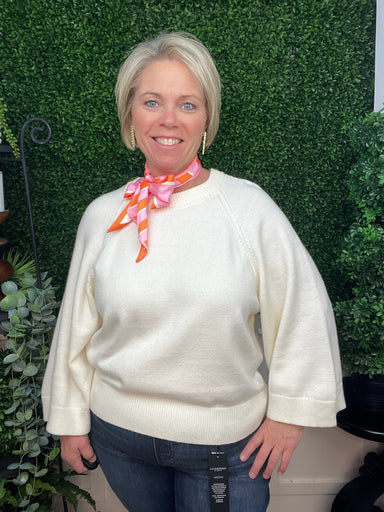 "Sweater" is attached for a trendy vibe! Renee, 5'2", is wearing a size large.