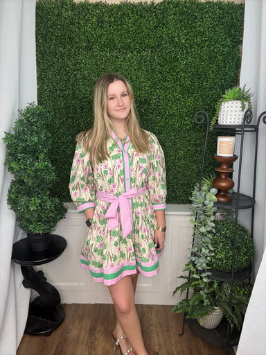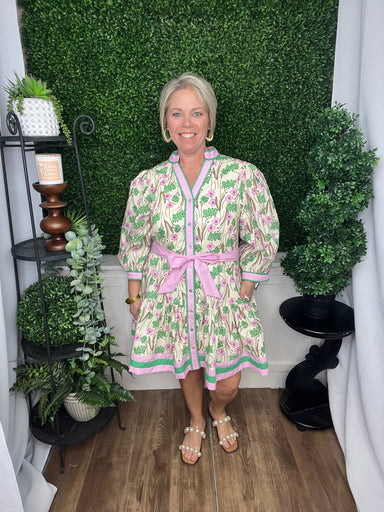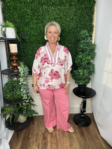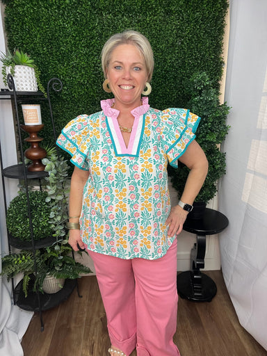 crew neck 3/4 sleeve top - green/pink