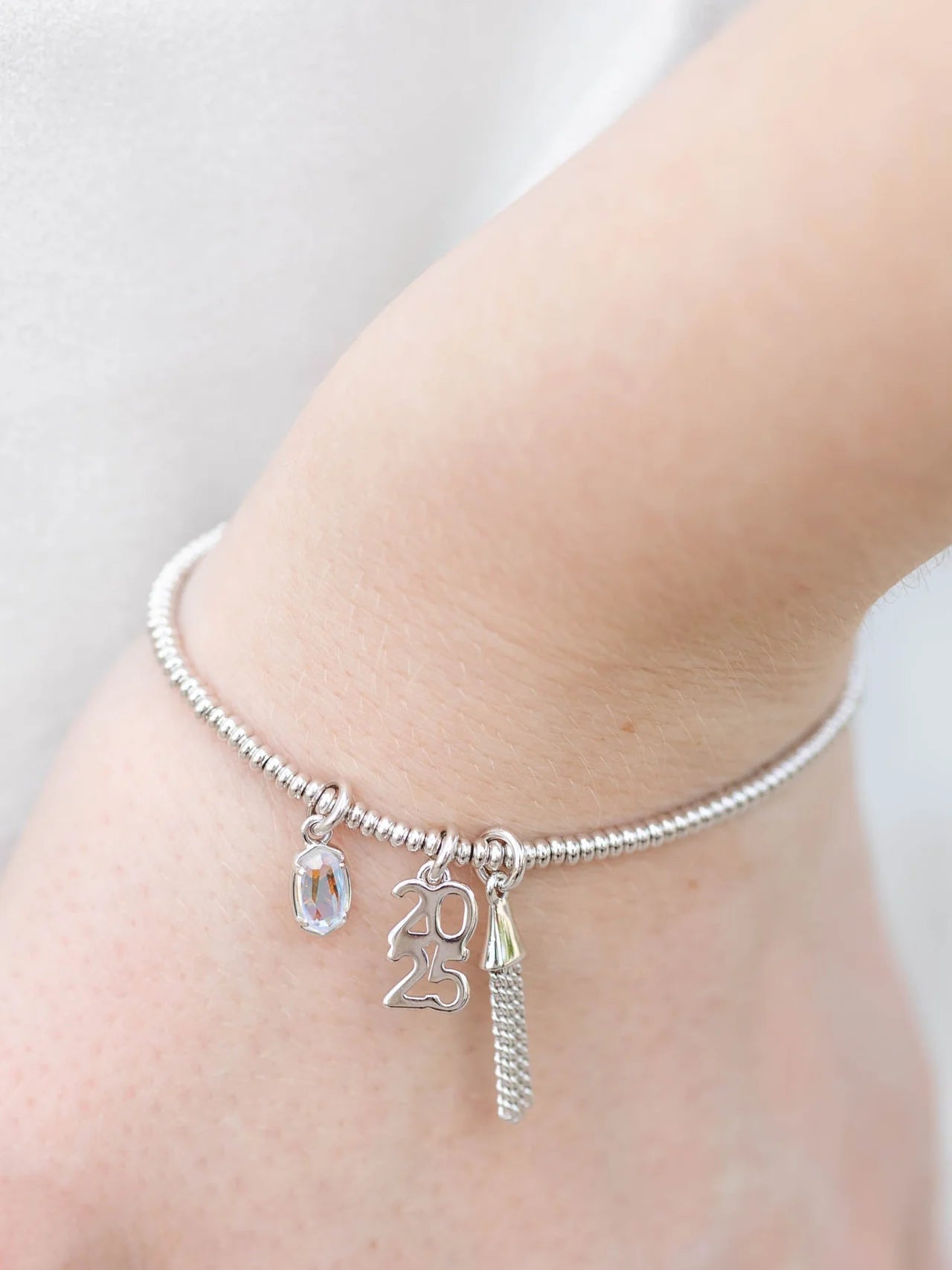 Simple with just a little bit of sparkle, the 2025 Graduation Stretch Bracelet in Silver is a stack staple that will shine on any graduates' wrist. Perfect for High School, College, Undergrad, anything worthy of celebrating their accomplishment!