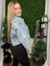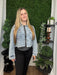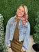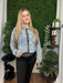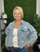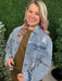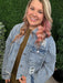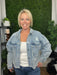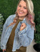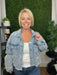 This medium wash denim jacket features charming scallop detailing and subtle glitzy accents, adding a playful sparkle to your fall outfits. Its unique design makes it a cute, standout layering piece for crisp autumn days.