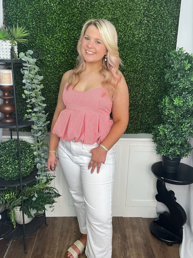 The Color Block Striped Lettuce Hem Detail in Pink/Taupe offers a cute and trendy update to your wardrobe. Its playful color blocking and delicate ...