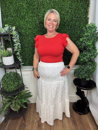 0126-SKRT-TIER-MAXI-PRL- Renee, 5'2", is wearing a size large. Mackenzie, 5'4", is wearing a size small.
