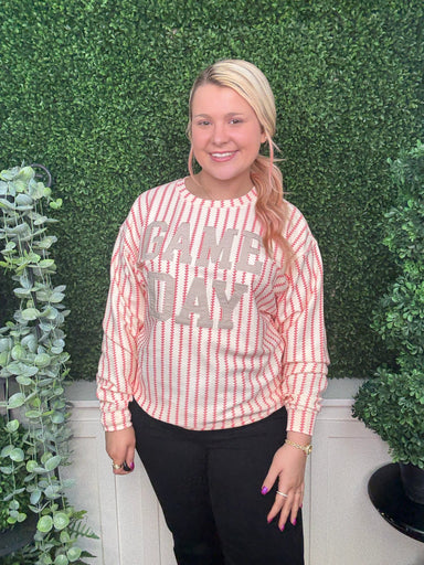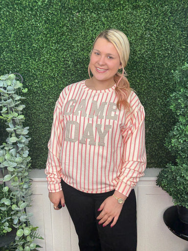 This ivory crewneck sweatshirt features a playful baseball stitch print, perfect for showing off your game day spirit in a cute and casual way. Its...