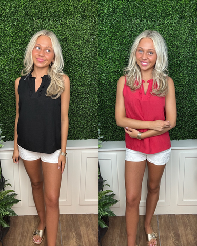 Timeless, polished, and effortlessly versatile — our Classic Black and Red Ruffle Trim Sleeveless Blouse is the ultimate wardrobe staple. Designed ...