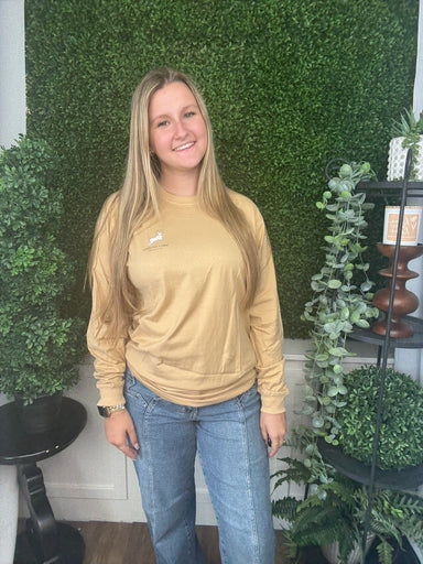 Stay cozy and cute with this bisque long sleeve featuring a charming camo deer design. Perfect for casual outings or relaxing days, its soft fabric...