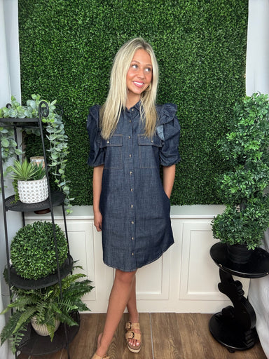 Classic denim meets feminine charm in our Dark Denim Ruffle Sleeve Button Down Dress — the perfect go-to piece for effortless everyday style. Desig...