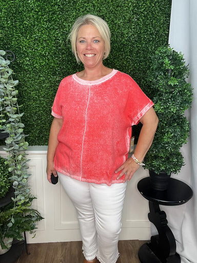 Stay cool and stylish in our Reverse Printed Cap Sleeve Top! The lovely coral color and unique design are perfect for any casual occasion. Made wit...