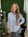 Textured striped pattern long sleeve button down collar shirt featuring pleated drape hem detail at back. Unlined. Woven. Non-sheer. Lightweight.