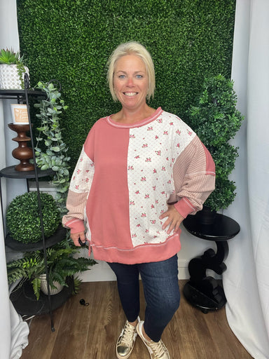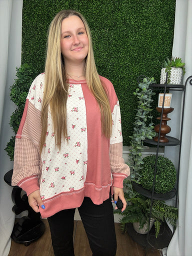 The Crew Neck Floral Print Color Block Sweatshirt in ivory and dusty pink blends soft colors with a charming floral design. Its cozy fabric and rel...