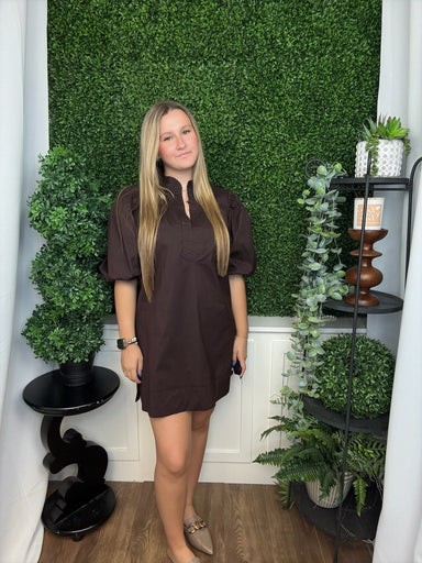 This brown mini dress features a refined China collar and elegant V-neckline, creating a graceful silhouette. The bubble sleeves add a subtle touch...