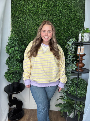 This yellow and light purple striped terry top features playful lettuce trim ribbing, creating a cute and cheerful look. Its soft fabric and relaxe...